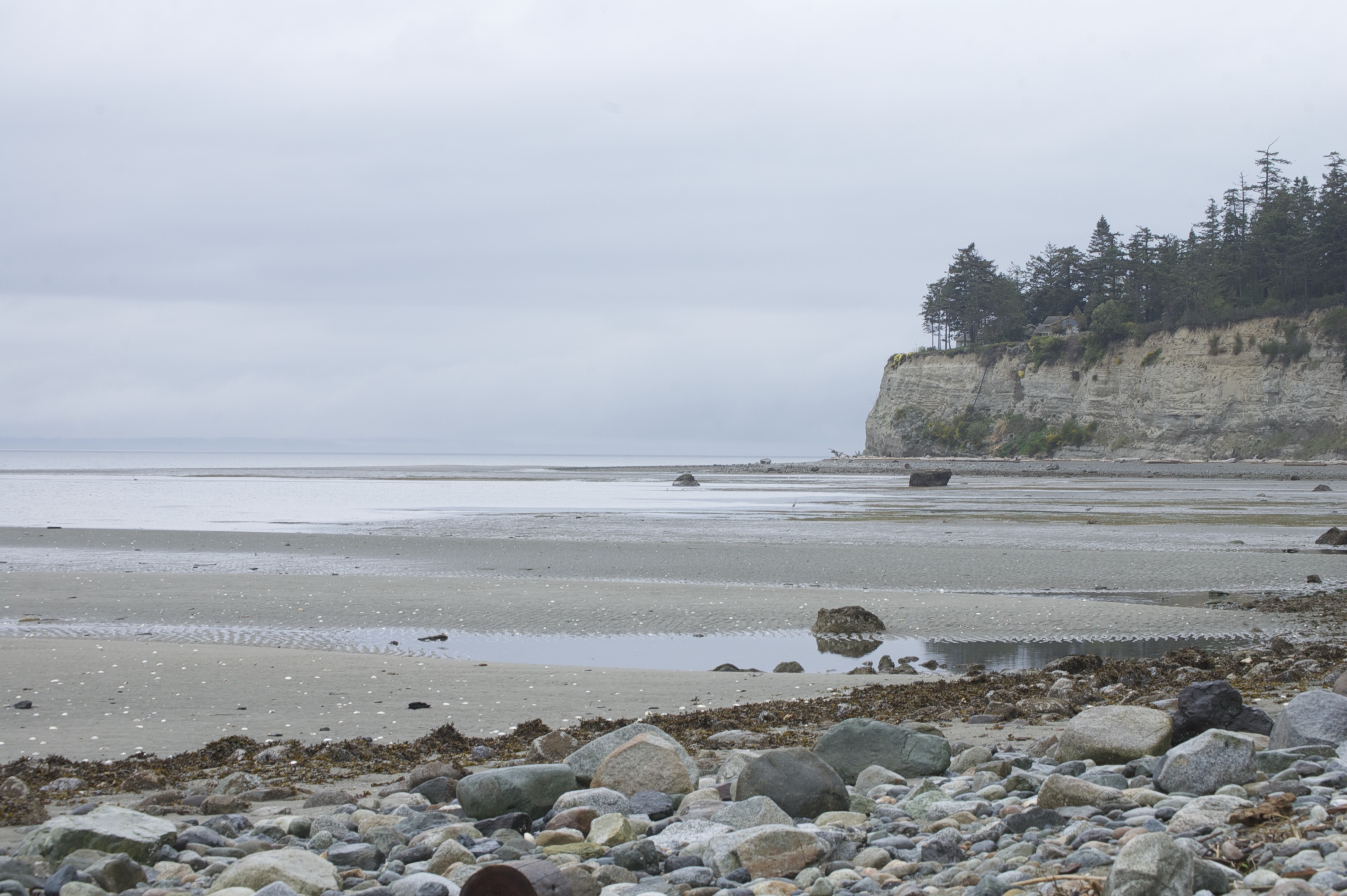 Yesterday my camera and I were busy at Double Bluff, a park on South Whidbey known for a dog park, views of Puget Sound, and an immensity of exposed beach at low tide. It is also known for bluffs that are made of sand that is perpetually sliding into the sea. The land is dynamic, and so is the water. It’s never the same, which is handy for a photographer. It is also bordered by private homes on either side and above. To show the nature without the structural distractions I count on fogs and mists, or conveniently tumbled trees, or an acceptance that I won’t take the shot. Here’s a picture I like, but after I loaded it into the computer I noticed a drain line draped down the hill.