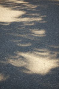 The photos and videos of the eclipse are overwhelming, especially in their quantity. That’s what happens when a rare event happens over a continent filled with smartphones wielded by people who understand science. Very cool. My experience was about an order of magnitude smaller, and yet was memorable. Whidbey Island had 92% of the eclipse (if you could find a place without any fog). That extra 8% made a bigger difference to my camera than to my eyes. I was lucky enough to aim for a place that just happened to be within 200 yards of the fog bank, Greenbank Farm. The Master Gardeners tend an exhibition garden there. Enough other folks with fancier equipment would be focusing on the Sun and the Moon. They were the big show. They were the cause. Causes are interesting. So are effects. Instead of buying special glasses or making a pin hole viewer, I wanted to see what Nature would create. Interlaced leaves create their own versions of pin holes. Instead of getting one image, a plant can create thousands. I wasn’t disappointed. The shrubs created some nice effects, but the grand conifers commandeered the parking lot as a massive canvas for innumerable crescents.