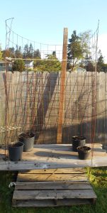 I’m trying the peas and beans again. Last year I extended the wire pedestal idea by making a ten foot tall wire hoop with the pots inside, elevated beyond bunny reach, and with plenty of room for the vines to climb. The engineer in me made sure it was stable despite being very light. That worked, but the hoop made it hard to get to the plants for watering and weeding. This year, the hoop has become a half-hoop, a tall semi-circle of a cylinder. Maybe better access will make them grow and me garden better.