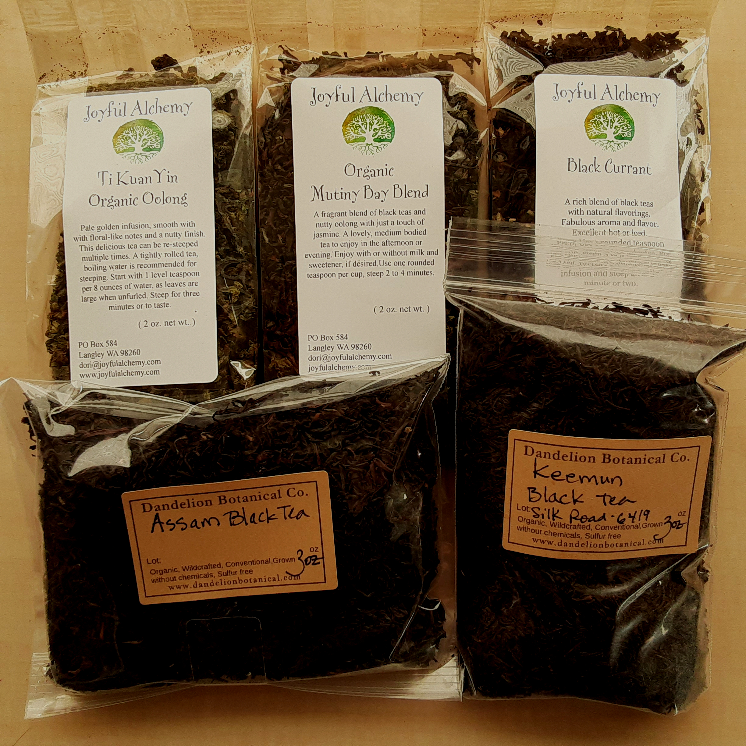 Take a look at what I bought. Three of them are blends (from Joyful Alchemy on Whidbey Island), but two are straight black teas (from Dandelion Botanical in Sequim, WA), something like a single malt scotch (a much more extravagant topic for later). All for about the same price as bags, and maybe cheaper. If you drink black tea you’re probably drinking either or both of those: Assam and Keemun. ‘Breakfast’ teas are usually a blend of those two, each blend getting a different name like English, Irish, etc. By buying both I can blend my own or go full Assam or full Keemun. Control and exploration for a very small fee.