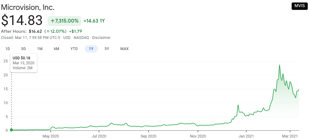 I really wanted to wait. I wanted to write this blog post after the market closes on Friday (March 12, 2021). MicroVision (the company) and MVIS (its stock) are both moving so quickly that waiting a day can change the story; but in that case, there’s value in telling this story then that story. Today (March 11, 2021), they announced earnings. Tomorrow, the market will officially react. In the last ten years of this blog, I’ve written about them over a hundred times. At some level the story’s stayed the same. There have also been a lot of changes; so, I guess I’ll add today’s activity to the list.