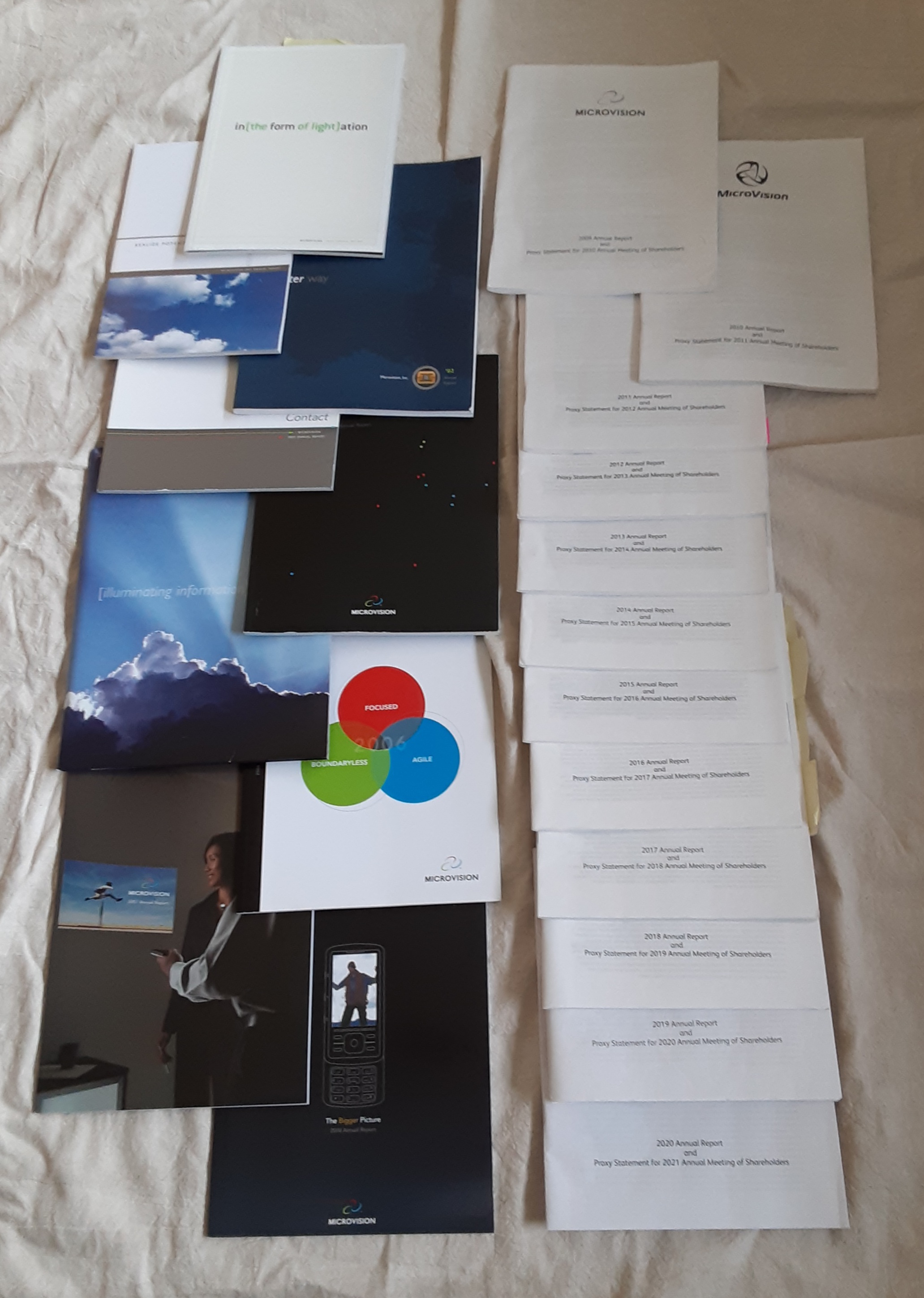 As many know, I’ve owned MVIS shares for over twenty years. I don’t access massive databases, because I don’t spend that kind of time and money. I’d rather focus on living than on investing; hence, my book “Dream. Invest. Live.” But what I do have is a pile of paperwork from years of owning the stock and trying to decipher management speak.