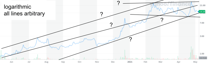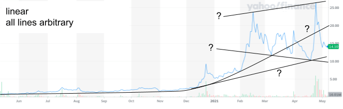 Look at the logarithmic chart and see a different story. Rather than the last three months looking like the volatile time, they look like a pause in a trend that began back in June 2020. That long term trend looks optimistic. The data and the trends from the last few weeks can look downright dismal, or at least dull when compared to expectations of constant growth. If that earlier trend is the truer story, however, then the short term is temporary. No one knows.