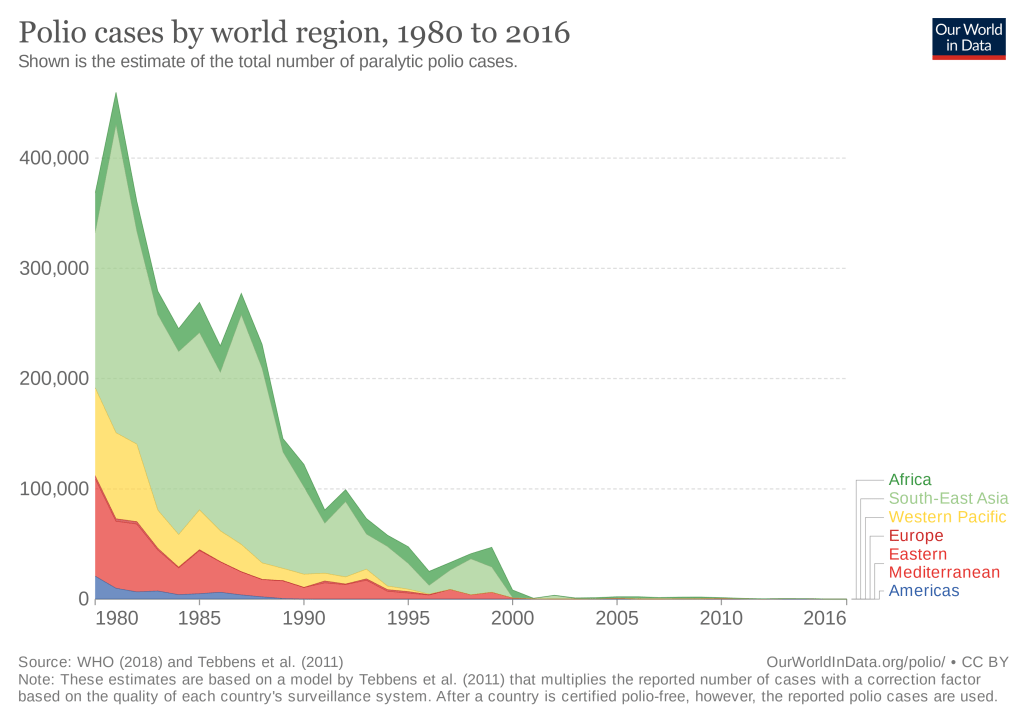 Diseases are down. Some diseases are not only down but are eradicated. Vaccines can do that. I still have the scar from my polio vaccine and am glad for that small price.