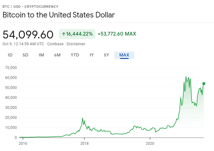 “This Bitcoin thing is going to be a thing.” I said and wrote about several years ago. As usual with me, I was too early into the trend. Too early would’ve been highly profitable, but I didn’t have much money, the currency had climbed ten-fold, and the technology included hurdles between where I had the money and where I could buy a coin. I relented. Bitcoin was at ~$220. Now, over $54,000. Eep and oops.