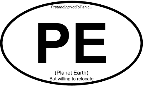 I even received my newest design for a car magnet, one of those ovals that proudly proclaim where the driver considers home. I see lots of them around, but none of them applauded my favorite place to live, hence, PE as in Planet Earth. (With a side note that I’m willing to consider relocating.)