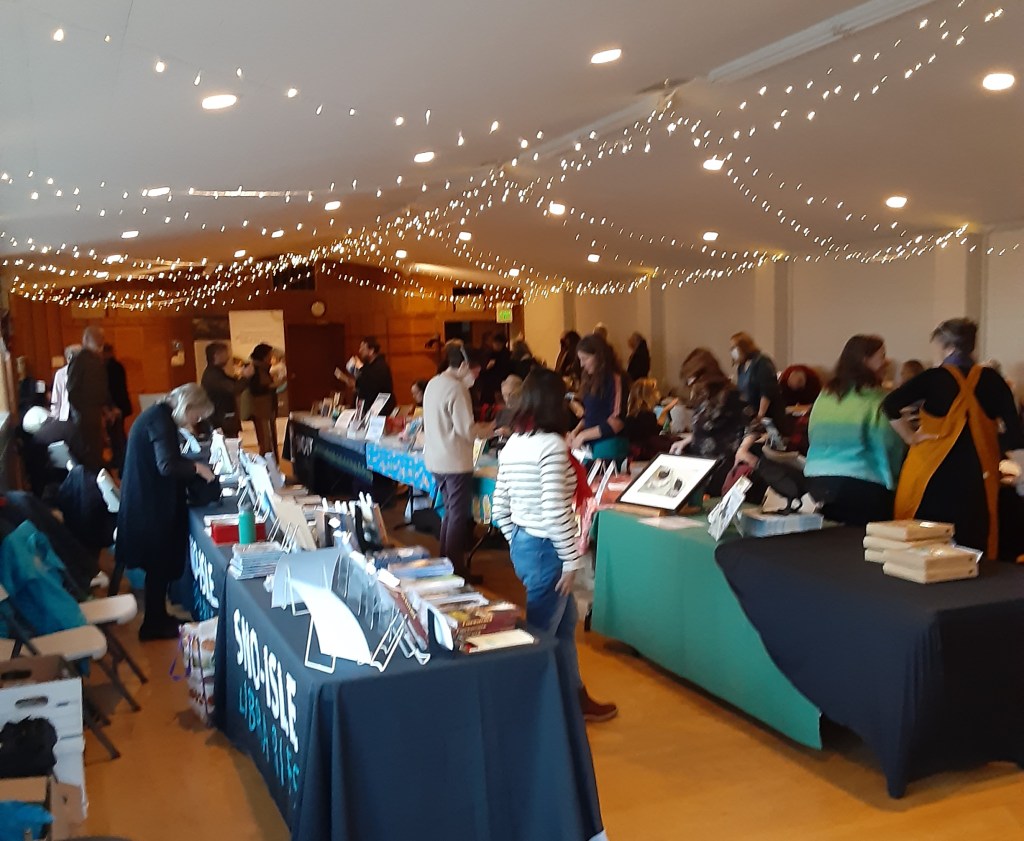 That’s more than enough, or maybe not. I’m starting to unwind. A yawn just told me so. Good. But, to me, the big thing was the community on Whidbey Island. The visitors and shoppers buying local books and art make it possible for Whidbey to be a creative place. The library system that hosts an event brought us together in ways that haven’t been happening while someday a writers association will rise again. Writers and authors there talked about writing groups, classes, and events. The Island Arts Council has a place for literary arts. There are a few writing groups on Facebook, but I’ll just pass along the one I know about most: Whidbey Authors. And there’s the podcast that I helped start but which is now under new management: writingonwhidbeyisland.com. Thinking of the variety of people there this evening makes me think the writing and reading community are reaching critical mass again. Yes!
