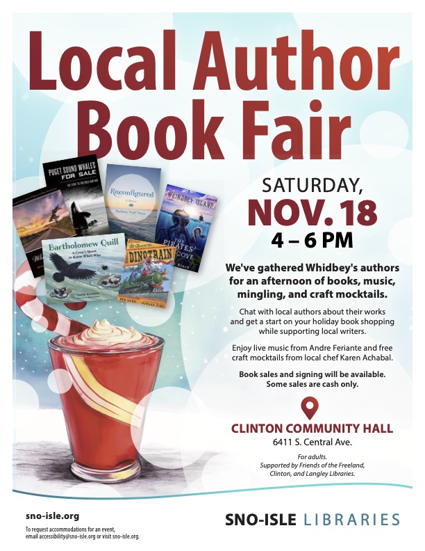 Can I use a more boring title? I don’t know. I’m too tired to think of one. I’m also too wired to not write; so, I write. Don’t be surprised. How else do you think a writer can unwind, especially after such an energetic event. For those who weren’t following the social media news (a niche) for Whidbey Island (a niche within a niche) for local authors (a niche within a niche within a niche) Sno-Isle Library System held a book fair at the Clinton Community Hall today. Thank you, Sno-Isle! (Including all of the individuals showed up to help make it happen.