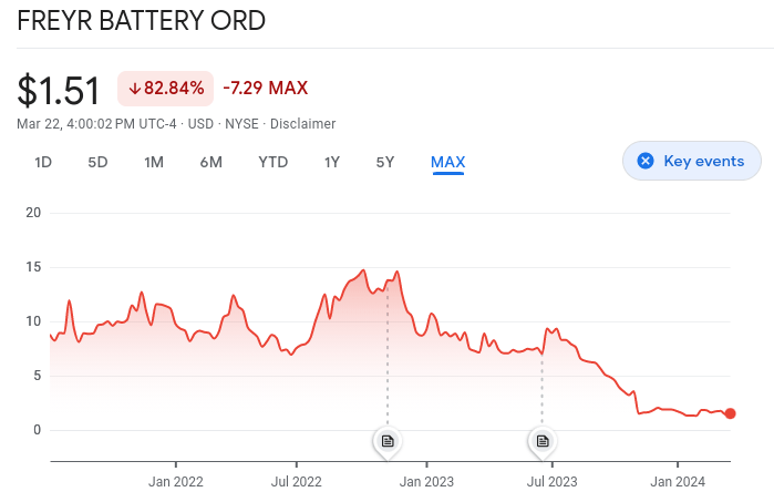 From the stock market side (which does have data), the company is just under a quarter-million dollar market cap, which is within the size I like. Google Finance is only showing data back to July 2021, when FREY was trading at ~$10. As I type this (March 22, 2024), the stock is ~$1.50. That’s a drop. Net income is negative, but that’s common with new companies and startups. Much of the stock drop has been since November 2022. The price seems to have stabilized since December 2023. A quick glance at social media describes a downturn within the sector, not something specific to FREY. Inconclusive.