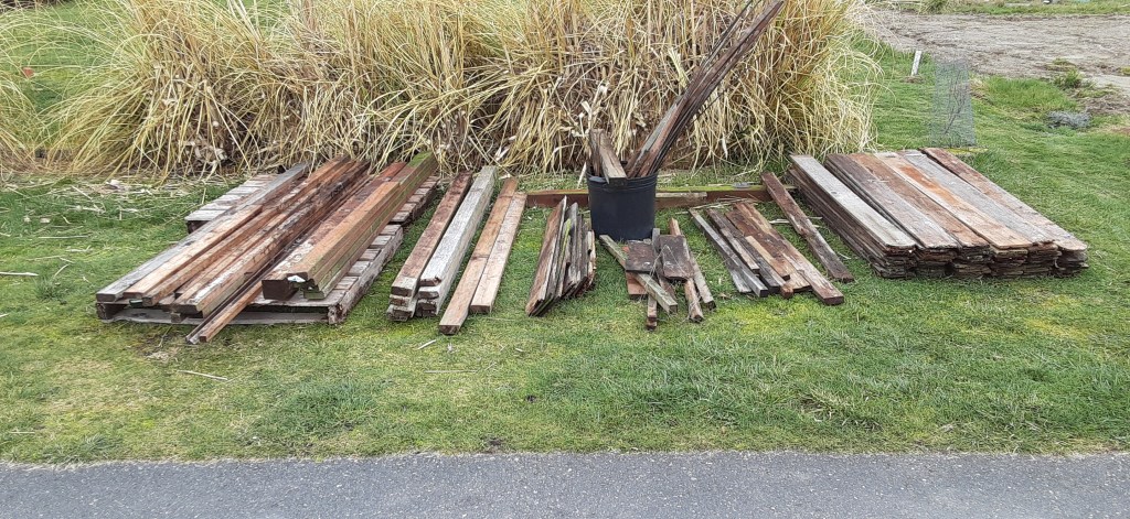 I’m getting new neighbors on the other side of my gap-toothed fence. Any new fence, or even repairs to the old fence probably won’t default to the original style. Out goes the fallen fence material. As I plowed through that pile, it became obvious that supply of fresh wood wasn’t as fresh anymore. Out it goes, too.