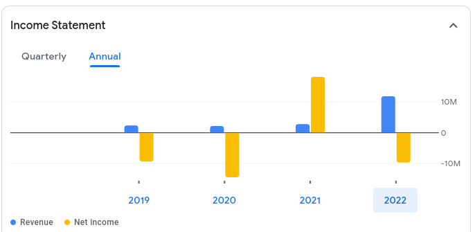 From the stock market side (which does have data), the company is just under a quarter-million dollar market cap, which is within the size I like. Google Finance is only showing data back to July 2021, when FREY was trading at ~$10. As I type this (March 22, 2024), the stock is ~$1.50. That’s a drop. Net income is negative, but that’s common with new companies and startups. Much of the stock drop has been since November 2022. The price seems to have stabilized since December 2023. A quick glance at social media describes a downturn within the sector, not something specific to FREY. Inconclusive.