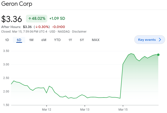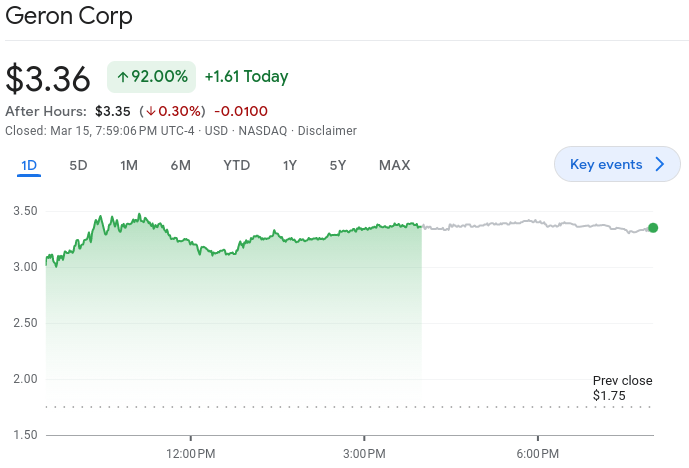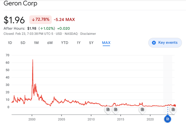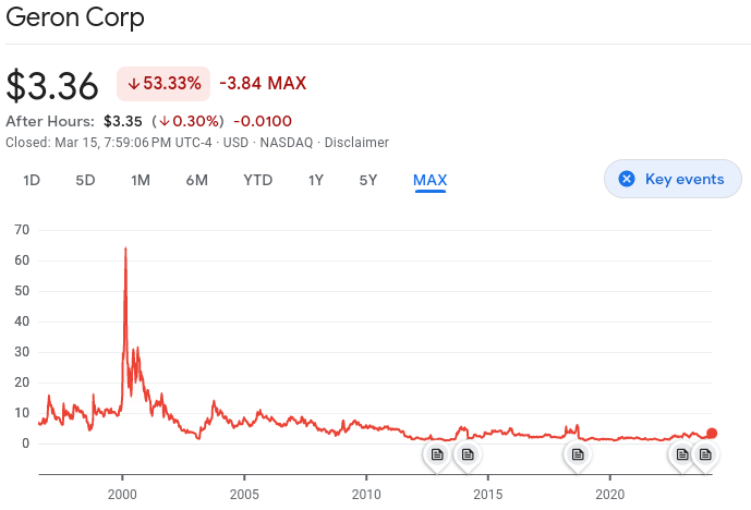 History: A lot of the near-term chaos will be fresh investors and long-term lurkers deciding to buy in now. They’re playing the strategy of purposely missing the first dramatic rise because they’ve used their money somewhere else in the meantime. I’m bad at guessing when that first dramatic rise rises, so I buy in early. My style is more relaxed and patient. For the last 25 years, Geron has had opportunities to announce breakthroughs, and I didn’t want to miss them. Unfortunately, the company sold off many of the technologies so it could survive. It looks like it has.