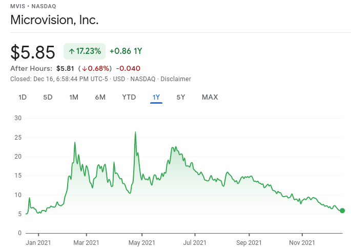 In April 2020, MVIS was priced at $0.15. Dismal times for my portfolio. By the end of 2020 it had climbed to just about $5. Hope! The percentage rise was great, but a large percentage increase of a small number can still be a small number. But that hope, that was valuable. Within the first quarter of 2021, MVIS rose to $28, with some interesting intra-day spikes. Investor sentiment carried my sentiments higher, with the potential of easing lots of monetary and personal anxieties. By mid-year it was back to just over $16. Now, it is back to about where it was 12 months ago; ~$5.