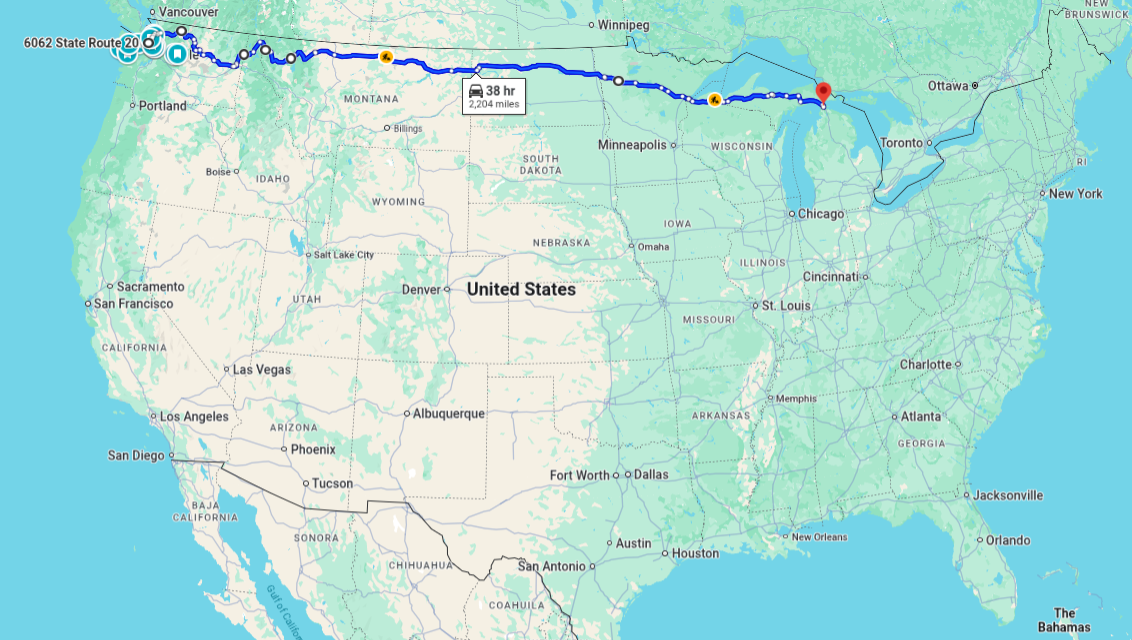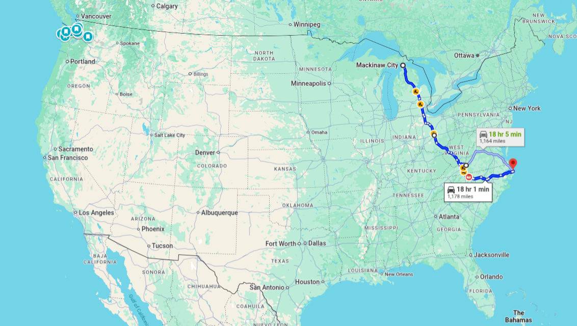 The route was based on a whim. WA Highway 20 starts near my home and gets routed across the northern tier of the state. It ends about the time it connects near US Highway 2, the highway system that is one notch less sophisticated than the Interstate system. East on 20, then 2 until 2 runs into the Great Lakes. Down the Michigan peninsula, diagonal down to my alma mater (VPI&SU) in Blacksburg, VA, then over to the coast.