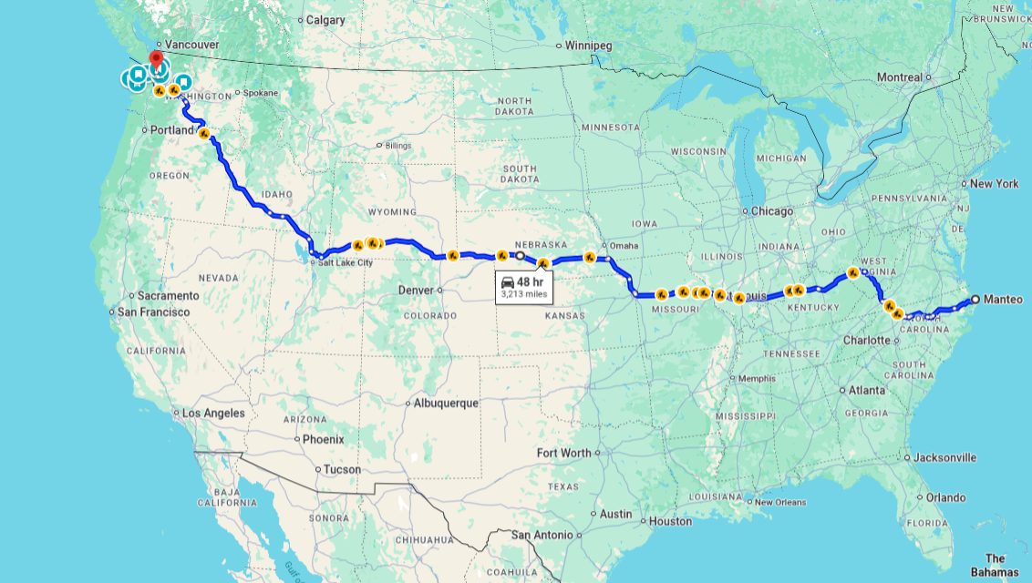 Back Again (Google estimate): 3,213 miles in 48 hours